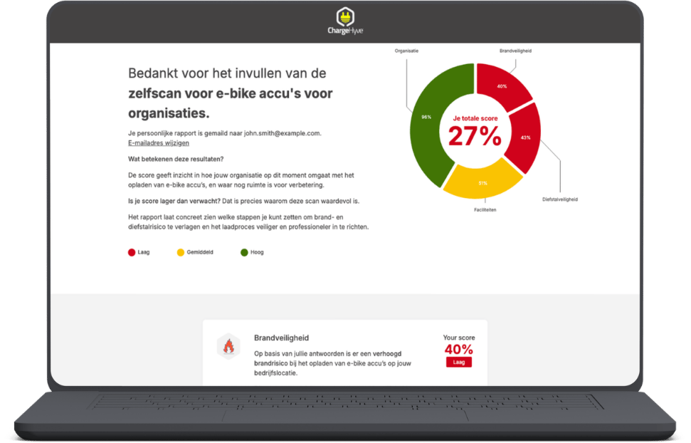 Deze zelfscan is ontworpen om u inzicht te geven in jullie brand- en diefstalrisico's omtrent e-bike accu's.